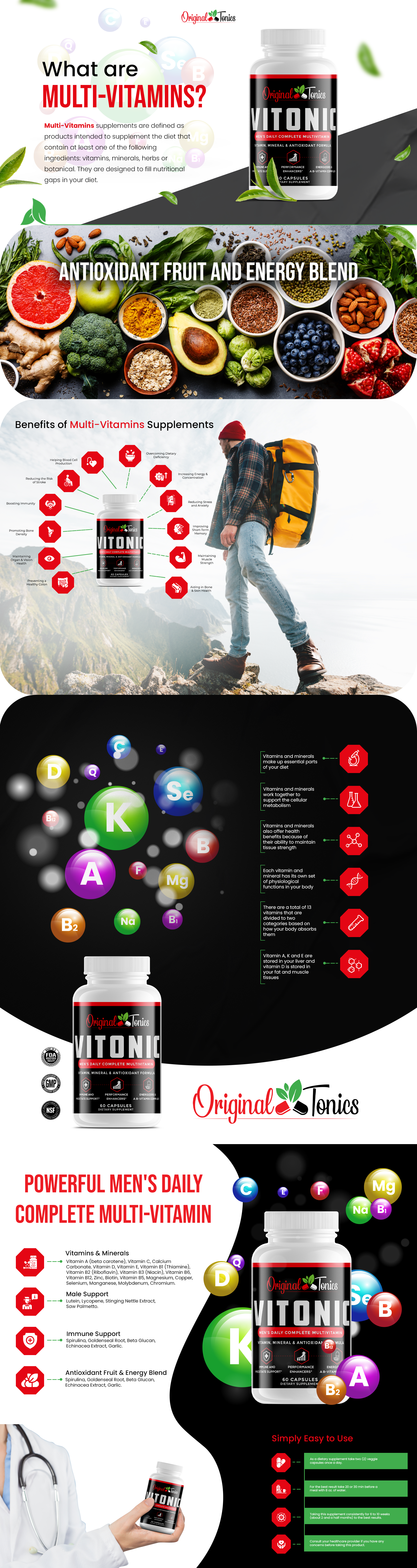 *VITONIC is focused on the anatomy and nutrient needs of men, geared toward helping them have and maintain proper nutrition. Aiding in mental alertness and increased energy. Contains a complete blend of the essential vitamins and minerals, powerful fruit and berry antioxidants to support detoxing, natural energizers from herbs and berries for a natural energy lift with no caffeine. -Male Support: May reduce the risk of cancer and cataracts, especially in men with a history of cancer. Provide essential vitamins and minerals that are not easily obtained from the diet, such as vitamin B12 and vitamin D.